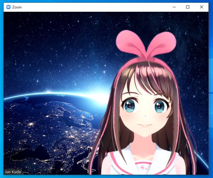 これにより、ビデオ会議(例は Zoom)で、次のようなバーチャル美少女 (になりきった私)が参加できるようになります。もちろん、声もボイスチェンジできます。
